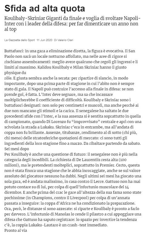 As per the valuations provided above, Skriniar is a much more cheaper option as compared to Koulibaly. GdS claim that Napoli still want 100 million euros to part ways with the Senegalese international. Also, the African star is older, he is going to turn 29 in just over a week.