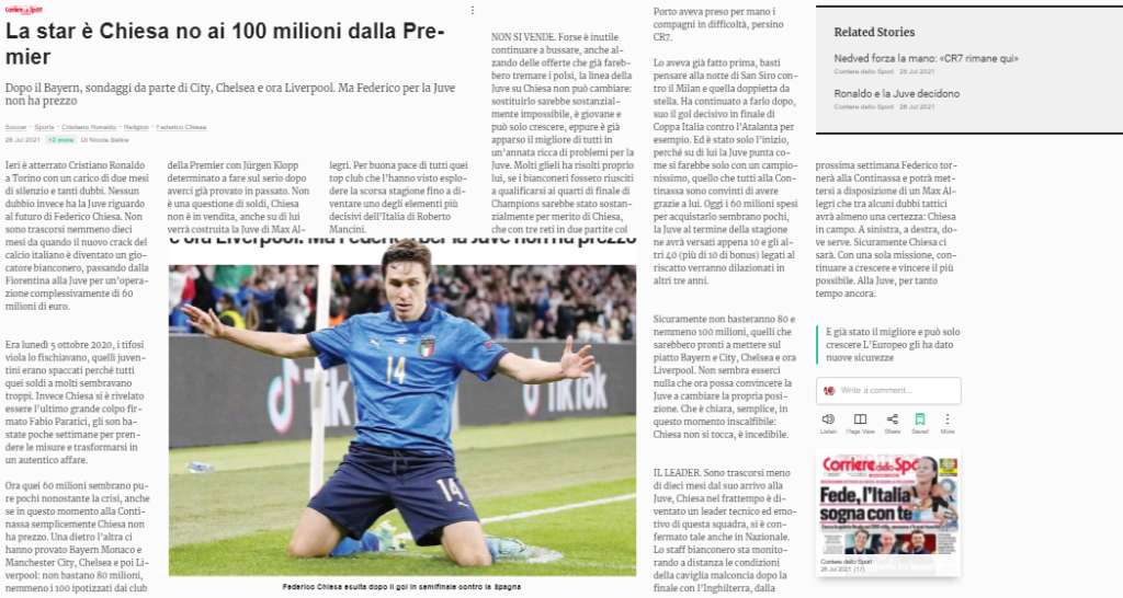 On the other hand, yesterday, Corriere dello Sport (press image provided below) reported that Klopp has tried to bring Chiesa to Anfield in the past and now, he is hell-bent on finally getting his signing done this summer.