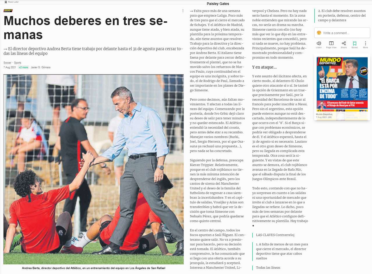 AS claim that from England, the likes of Liverpool and Manchester United have been insisting on signing Saul from the reigning La Liga champions, who are prepared to let him leave for the right price. However, so far, the Spanish side have not received a single offer. It is stated that the player could agree a move at the very last minute in this transfer window.