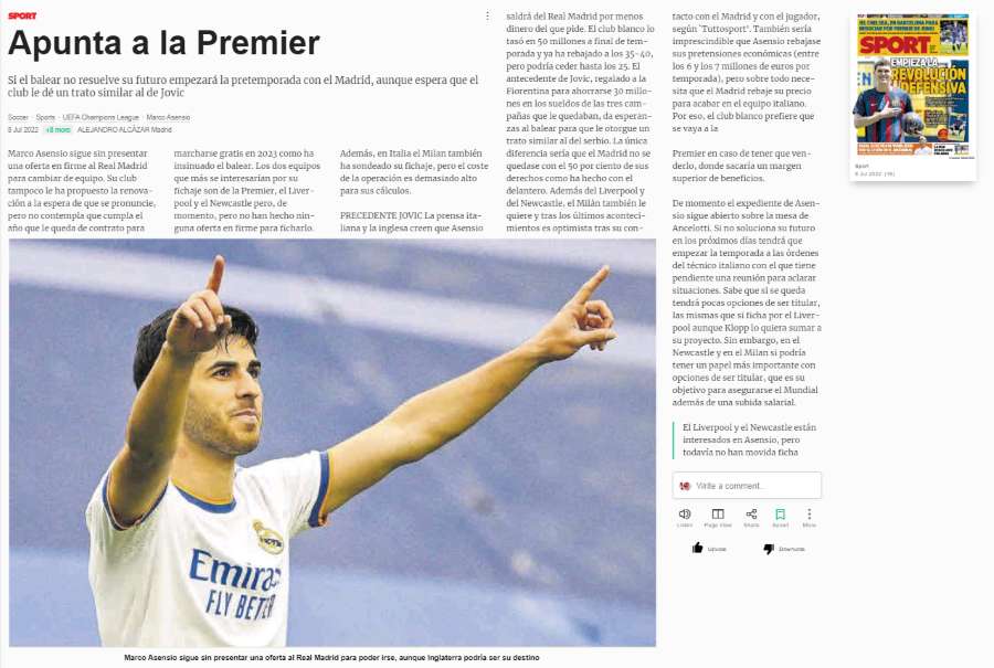 Asensio knows that he will not be a starter if he stays at the Bernabeu and Sport claim that he is also aware the situation will be the same at Anfield even if Klopp is pressing to add him to his project.
