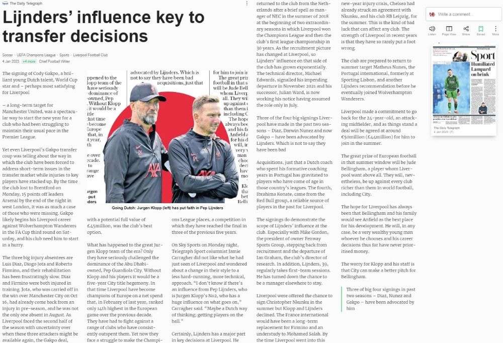 As per today’s version of The Daily Telegraph (news image provided below), key signings for the Reds have been advocated by assistant manager, Pep Lijnders.