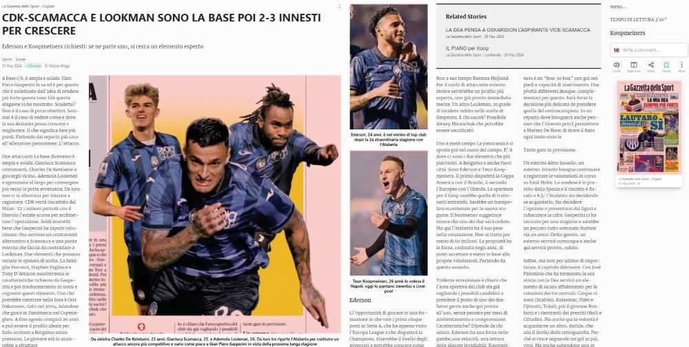 As per today’s version of La Gazzetta Dello Sport(press image provided below), Atalanta hope to keep both Koopmeiners and Ederson at the club.