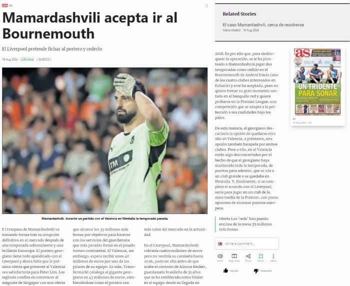 As per today’s edition of AS (news image provided below), Liverpool have now tabled a bid worth more than £30million to close the signing of Mamardashvili.