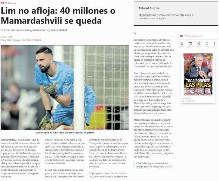Early this morning, we covered a story from Spain stating that Valencia need to sell to balance their books, but in contrast, AS mention that Ruben Baraja’s side are in a stable situation financially hence they don’t have to sell Mamardashvili this summer. Therefore, Valencia have been in no rush to cash in on the Georgian and did not want to lower their valuation even a cent.