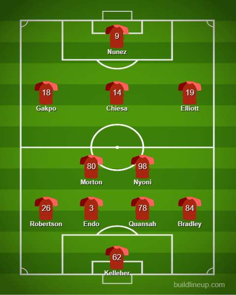 Harvey Elliott is expected to be deployed in the right flank and Gakpo could be on the opposite side against his former club.