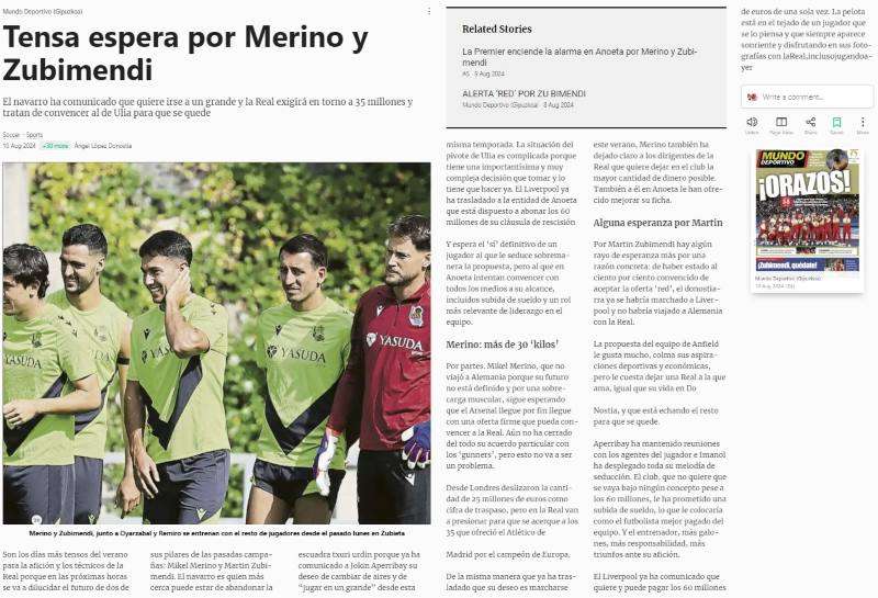 Zubimendi featured in the friendly contest against Union Berlin and the Spanish side believe he would have left to join Liverpool and not traveled to Germany if he had been 100% convinced by the offer.