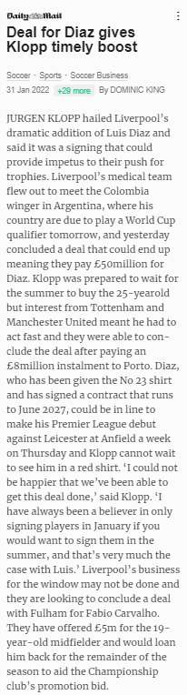 On the other hand, this morning, The Daily Mail (press image provided below) have reported that after luring Diaz, the Merseysiders are looking to finalize the signing of Carvalho before deadline.