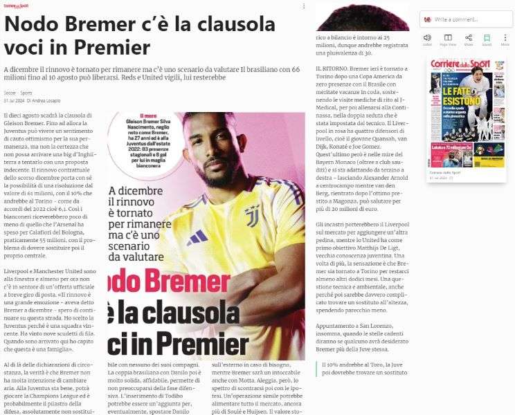 As per yesterday’s version of Corriere dello Sport (news image provided below), Liverpool and Manchester United are vigilant and are ‘waiting’ to sign Bremer from Juventus.